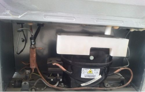 3.用螺丝刀把冰箱后盖的螺丝拧开,把后盖取下来,我们会看到压缩机上有个白色的盒子和一个白色的排水孔。